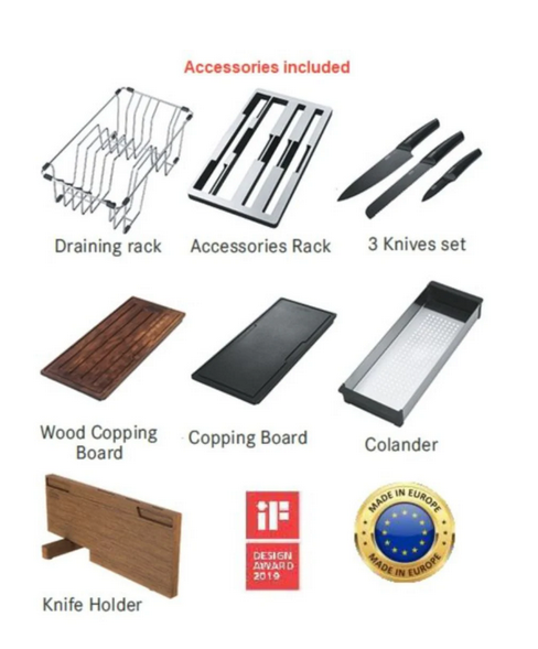 Accessories : the Box-Center sink and accessories integrate with each other. Wooden chopping board, Hygenia chopping board, stainless steel tray and the set of 3 knives are enclosed in a compact and functional solution.