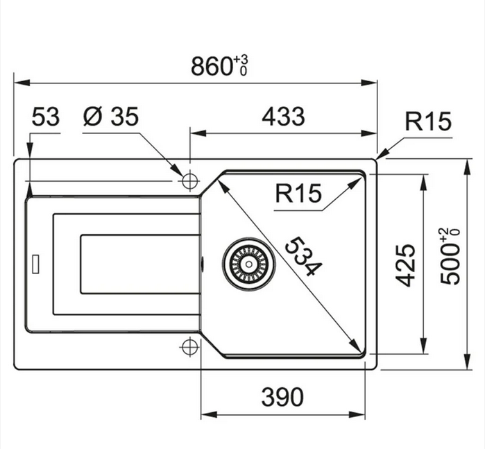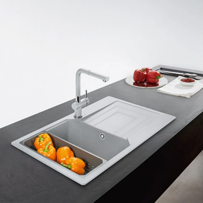 single bowl , over all size : 860 x 500 x 220mm , R15 ,easy to clean, and suitable for food contact. sink that is available in three colors , bowl size : 390 x 425 x 220mm ,