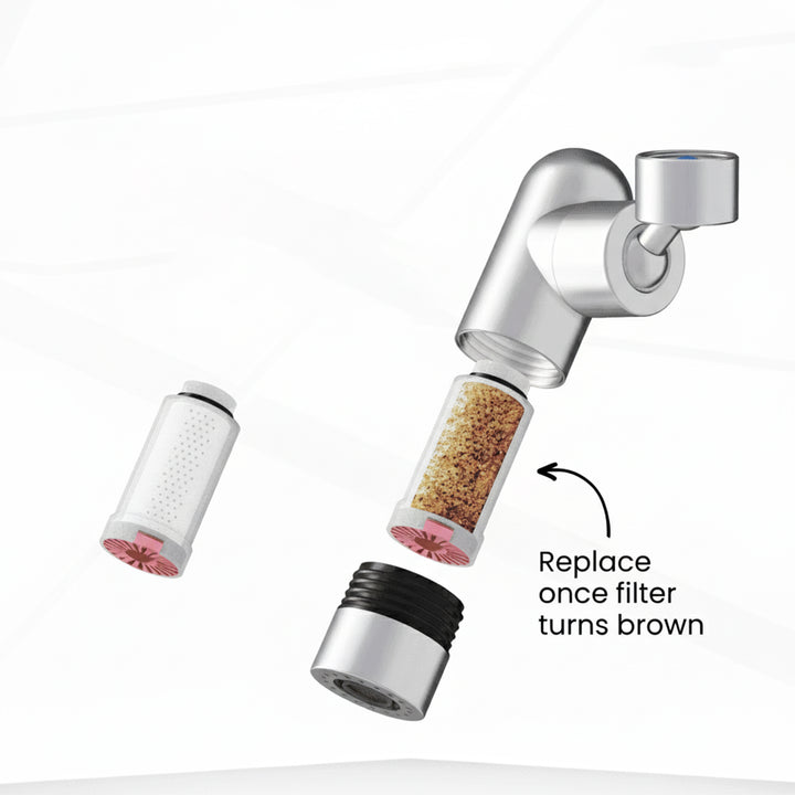 Equipped with a built-in filtration system, it removes dust, rust, and sediments to provide clearer, safer water for everyday use. The package includes two free replaceable cartridges for long-lasting performance.